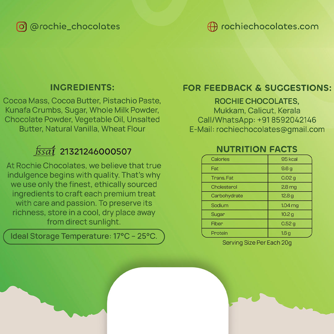 Cocoa Mass, Cocoa Butter, Pistachio Paste, Kunafa Crumbs Sugar, Whole Milk Powder, Chocolate Powder, Unsalted Butter, Natural Vanilla, Wheat Flour,